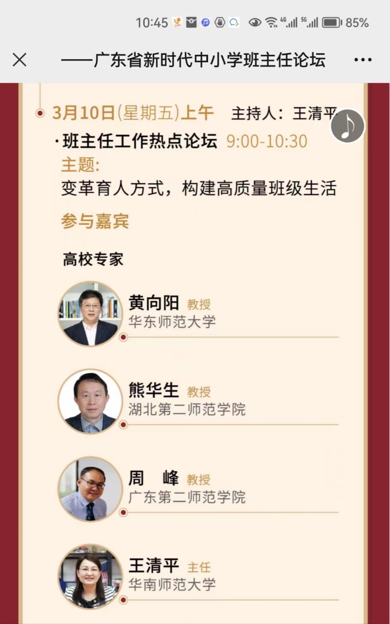 本网讯(通讯员 张婧)为了进一步完善德育工作制度体系、促进中小学市政课程改革创新、提升德育工作骨干队伍的专业素质,2023年3月9日-10日,广东省教育厅举办2023年度全省中小学德育工作会议暨新时代中小学班主任论坛,并邀请社会各界专家教授与会。长江班主任研究中心前主任、湖北第二师范学院教育科学学院熊华生教授参加会议并做主题发言。