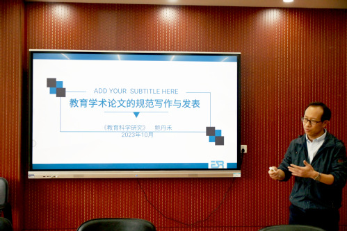 讲座伊始,鲍丹禾博士简要介绍了《教育科学研究》杂志社的历史改革与发展。随后,鲍博士主要从教育学术论文的选题、文章标题、摘要、关键词、正文、参考文献、论文修改等方面进行了讲解。鲍博士重点讲解了教育学术论文选题要有理论深度与实践指导价值,同时要结合教育学术前沿。对于文章标题的拟定要准确、简洁与清楚。在正文撰写方面,鲍博士指出要注重选题、搜集材料、拟定提纲、修改定稿等流程。对于参考文献方面,鲍博士建议尽量引用近两年的期刊文献、注重引用规范,避免引而不用,用而不引的情况。讲座最后,教科院师生与鲍博士进行了深入交流与研讨,鲍博士对大家提出的问题进行了详细地解答并给出了相应的建议。